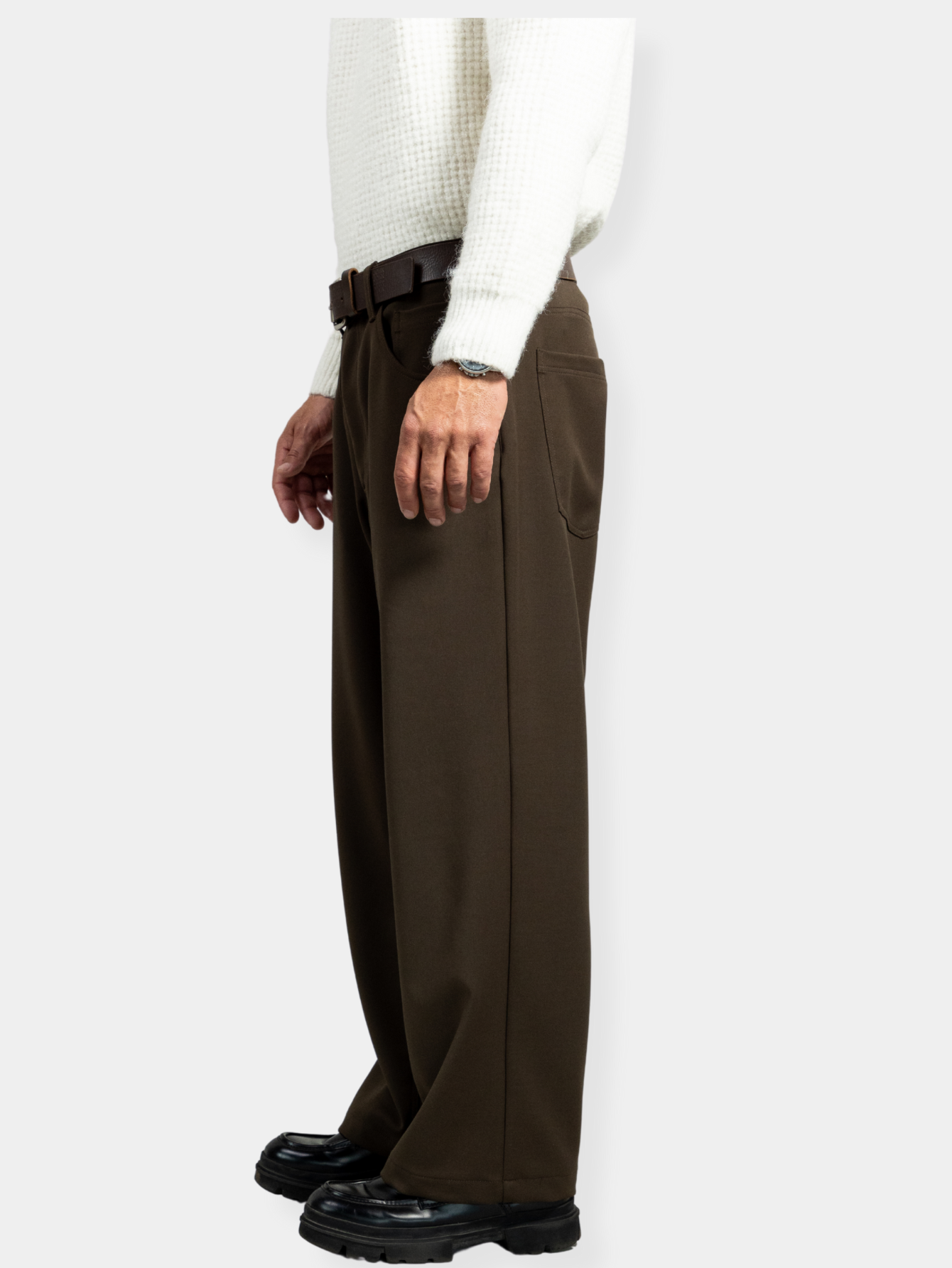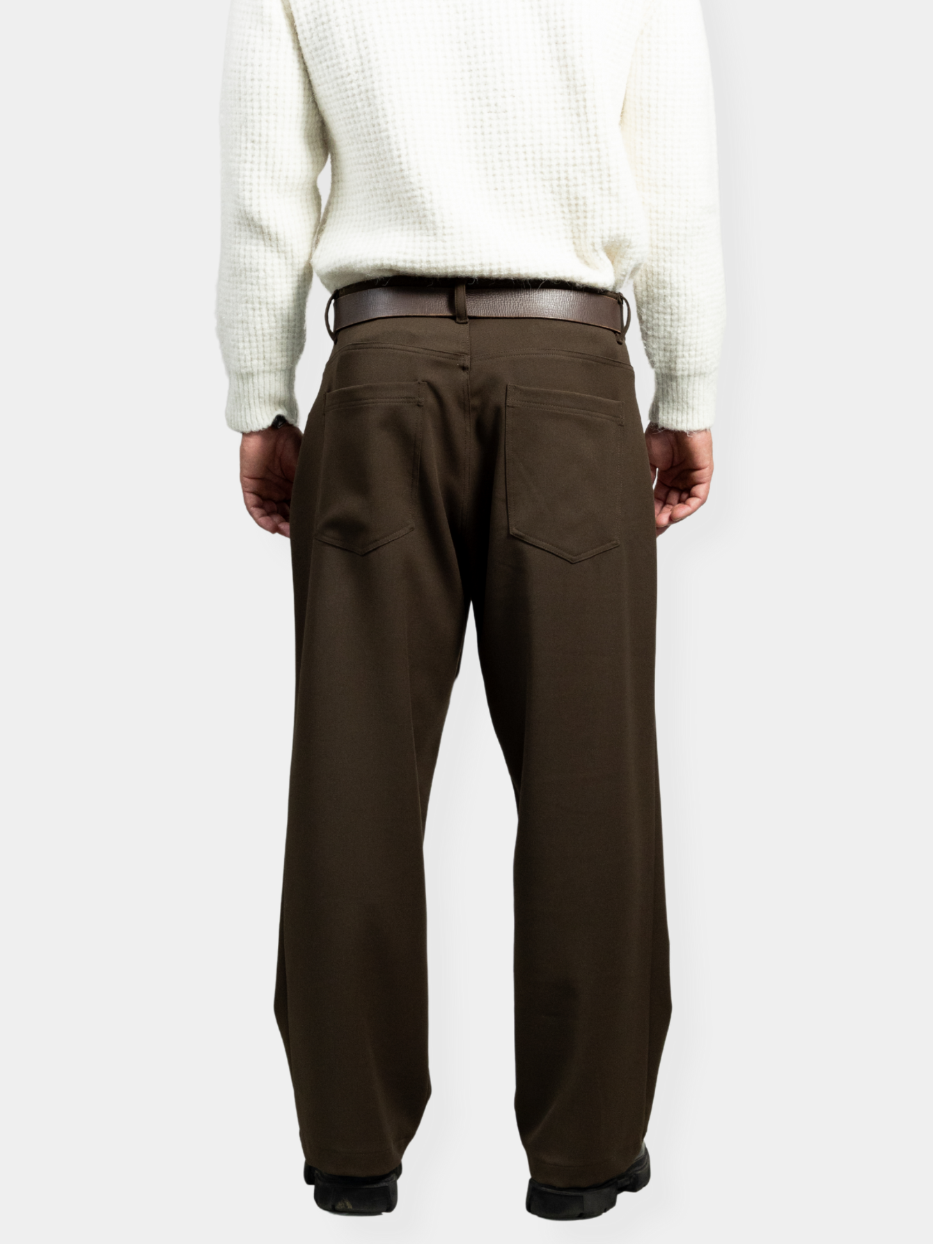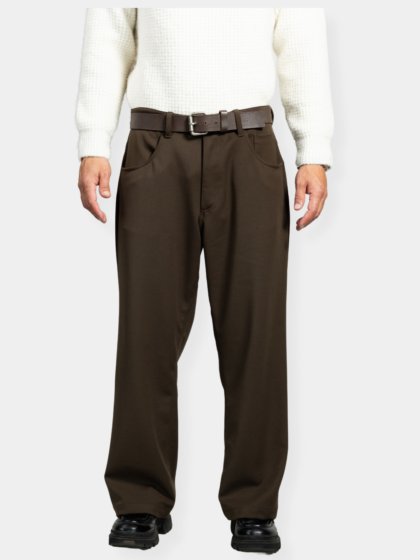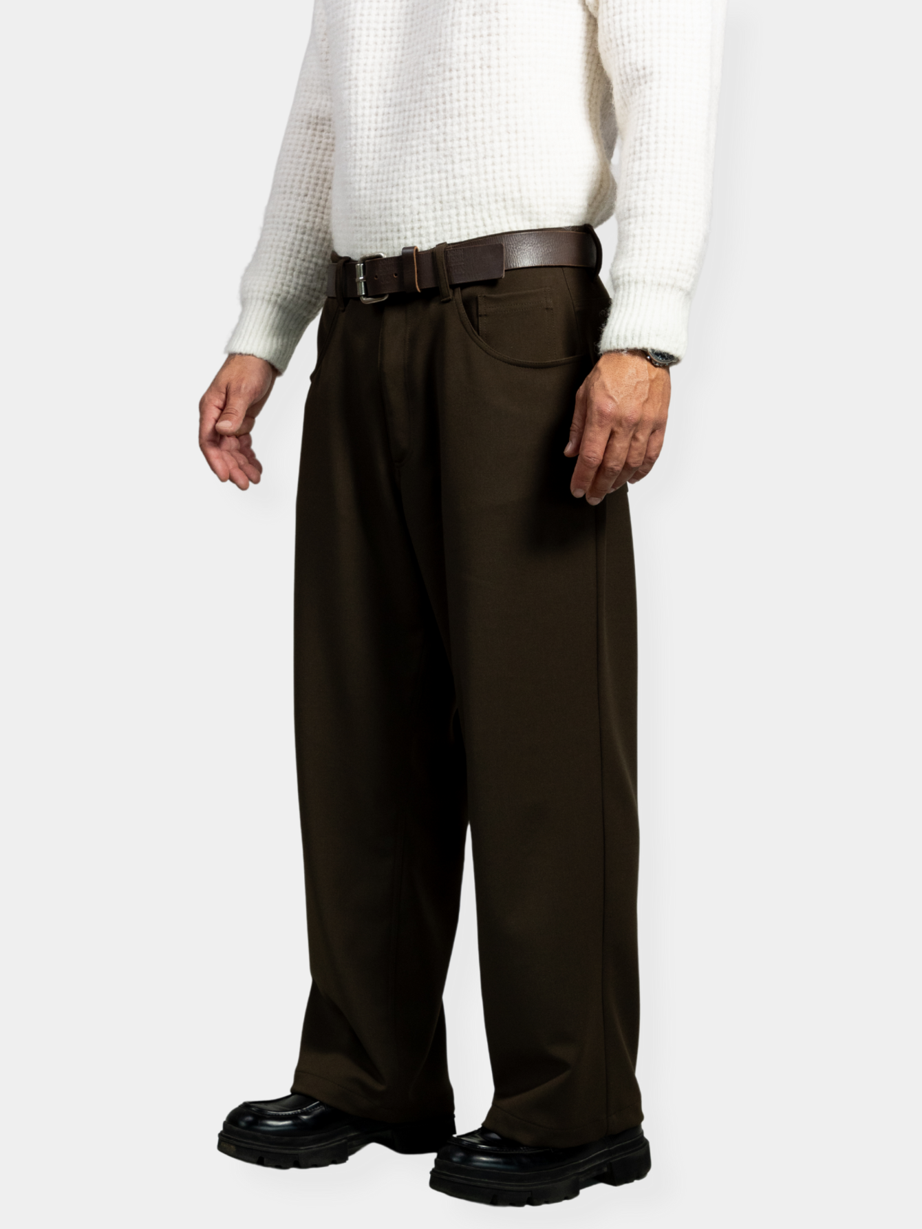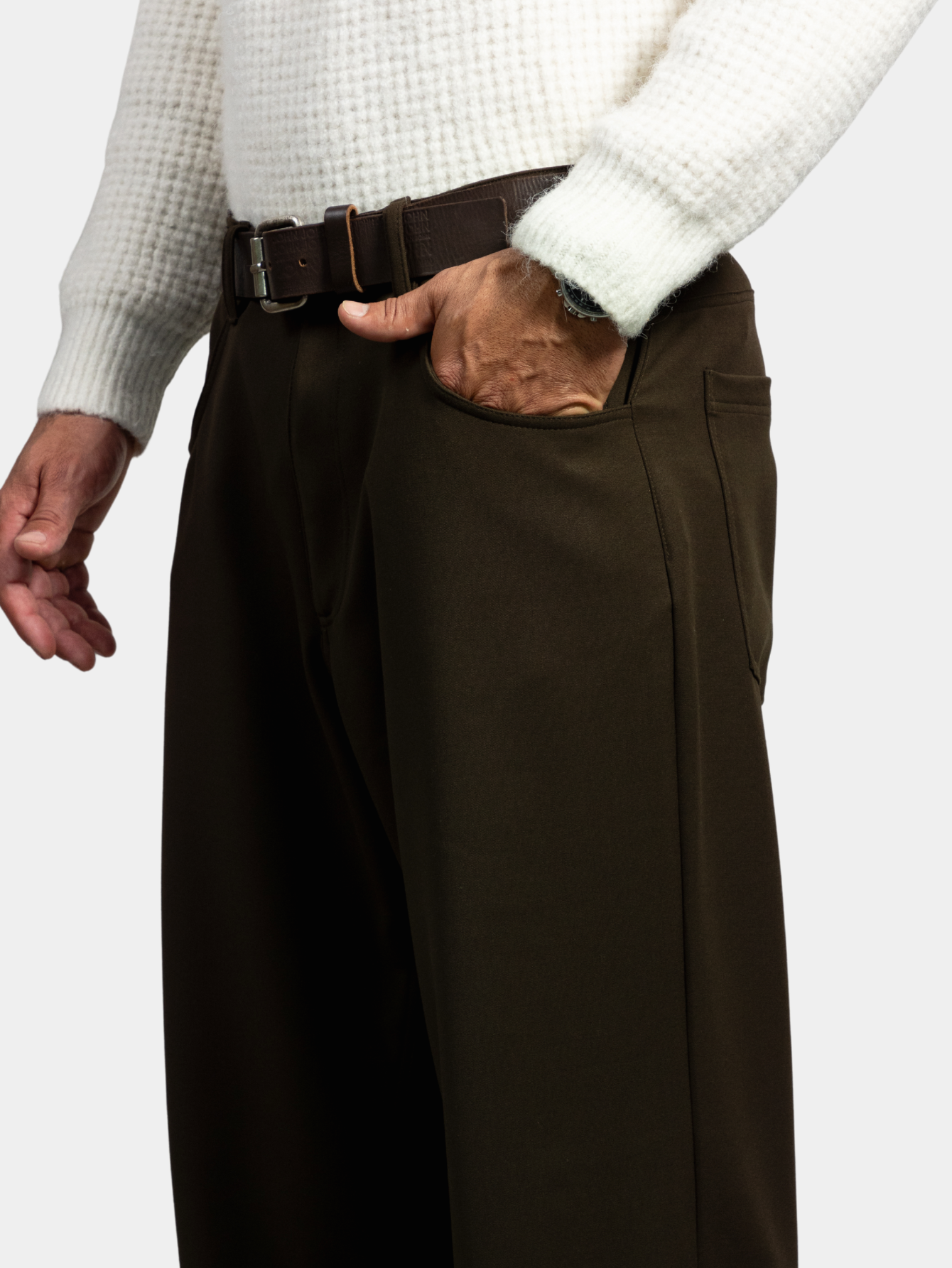 A modelagem relaxed entrega uma silhueta ampla e precisa, com caimento pensado para o homem que busca conforto sem perder estrutura. O verde fechado traz personalidade contida, sem abrir mão da neutralidade. Ideal para composições sóbrias com identidade.